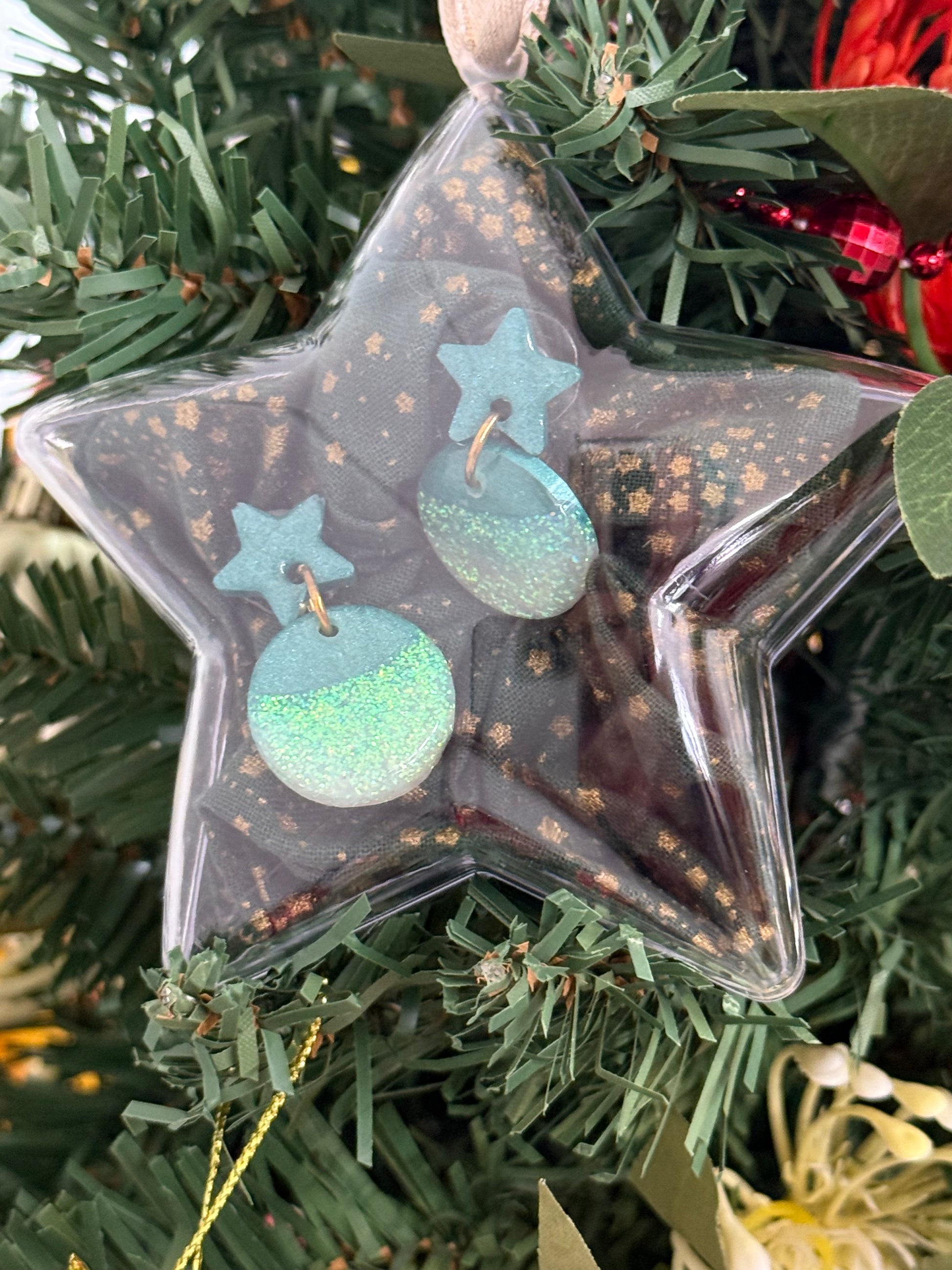 Accessorise with a touch of whimsy and celestial charm. This elegant set includes a playful and chic green scrunchie adorned with glittering gold stars, accompanied by a beautiful pair of Christmas Angel Dangles that's sure to leave you feeling merry and bright.